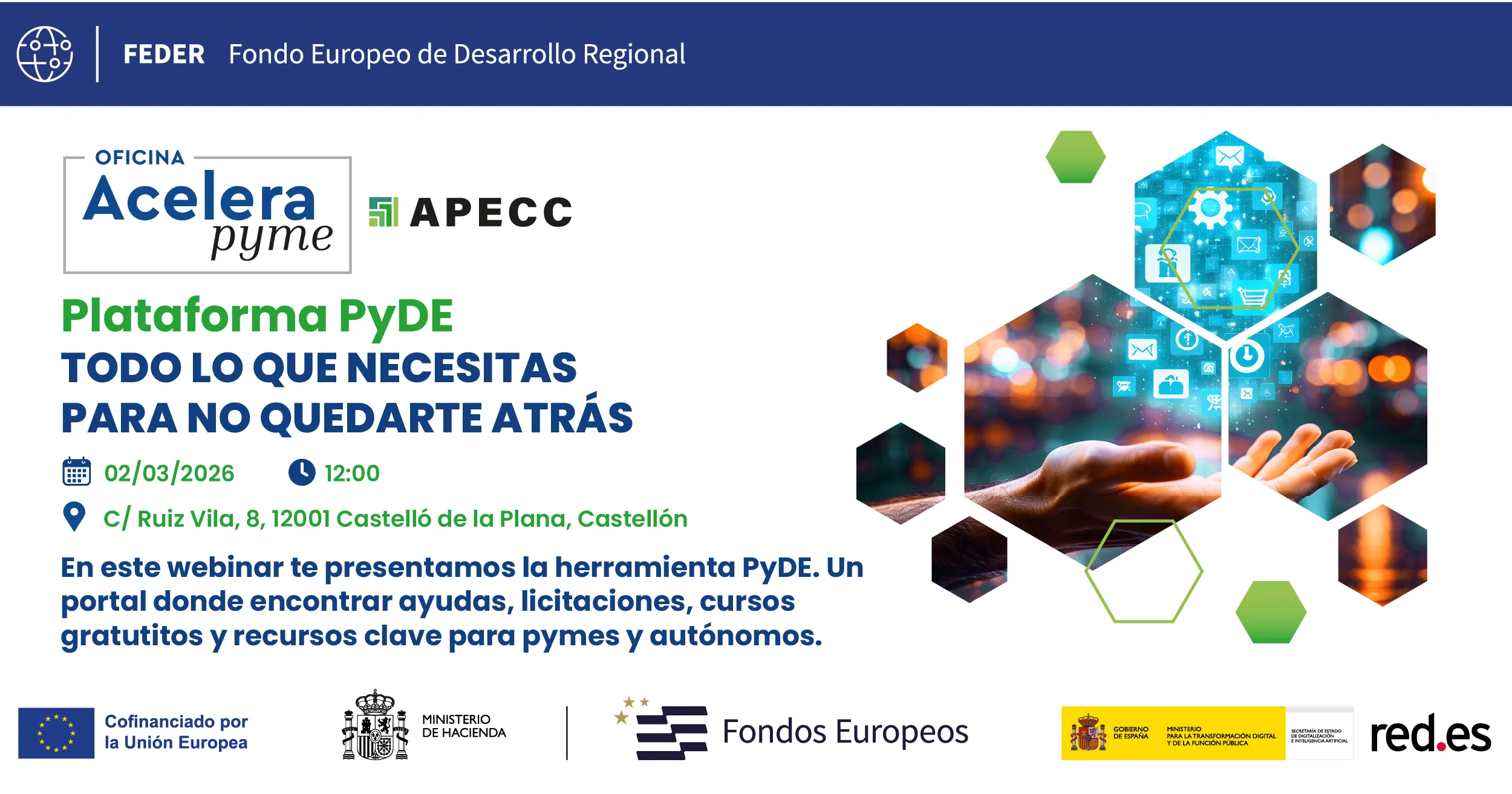 En este webinar te mostraremos PyDE, la plataforma que facilita a pymes y autónomos el acceso a ayudas, licitaciones, formación y recursos para la digitalización.